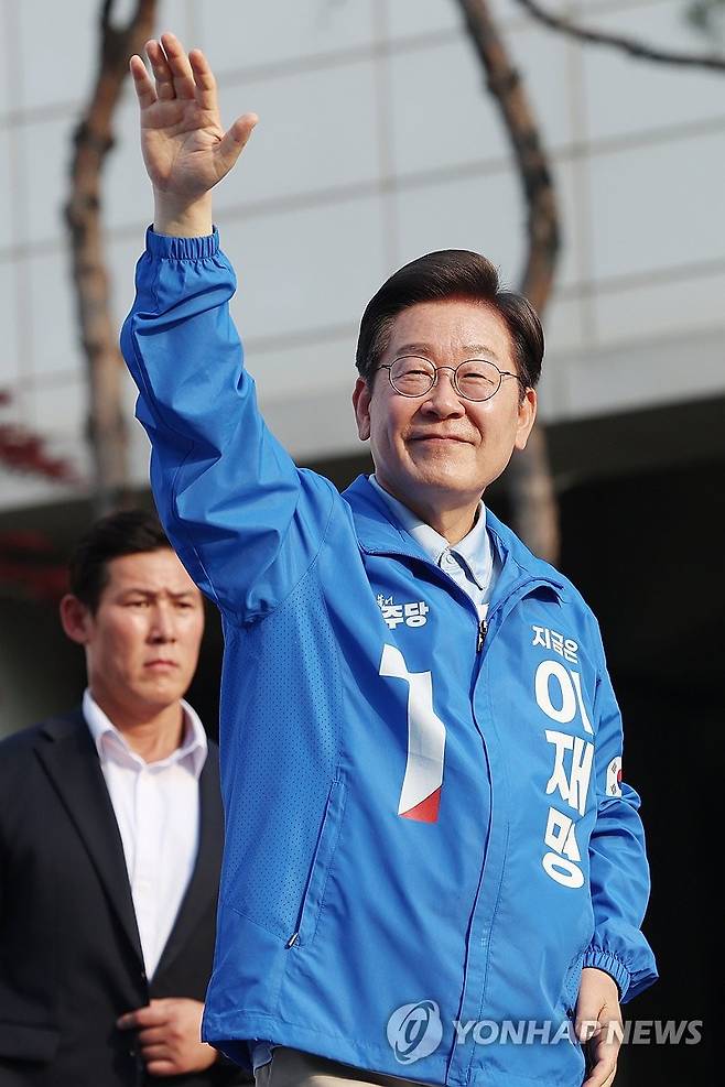 (남양주=연합뉴스) 김주성 기자 = 더불어민주당 이재명 대선 후보가 26일 경기 남양주시 평내호평역 광장에서 열린 유세에서 연설을 마친 뒤 시민들에게 인사하고 있다. 2025.5.26