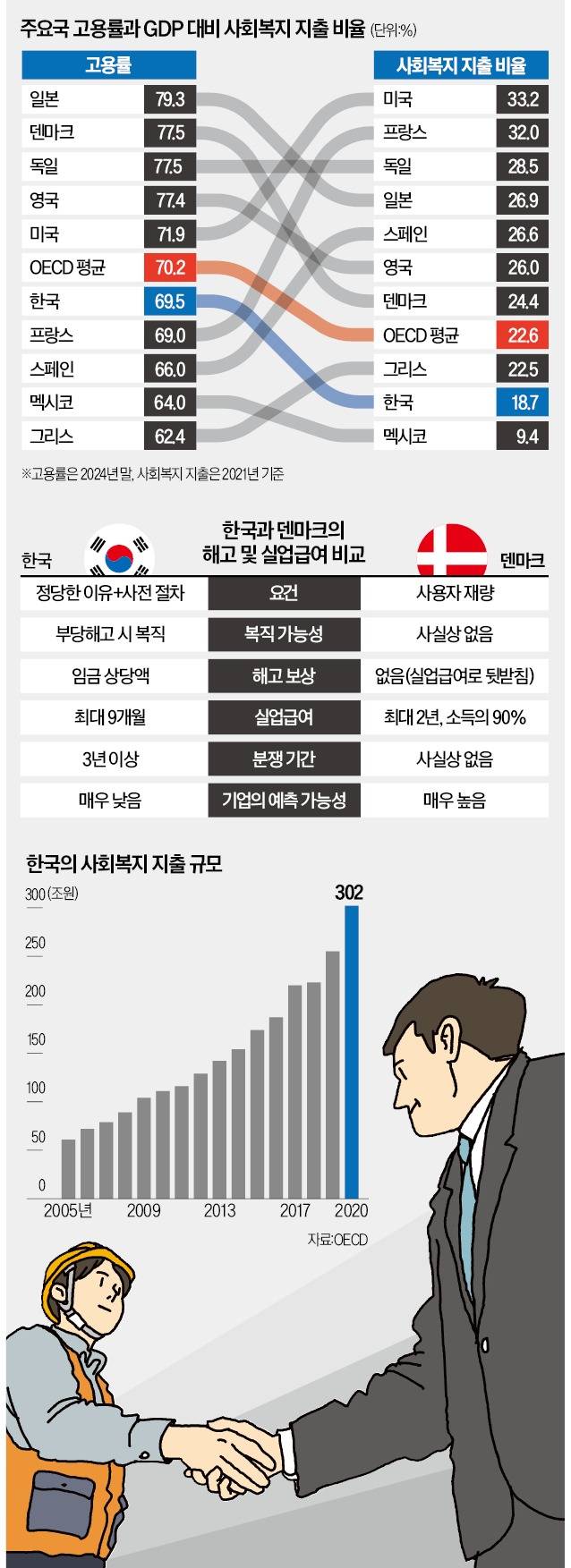덴마크의 2024년 말 기준 고용률은 79.3%로 경제협력개발기구(OECD) 최상위권이다. 노동시장 경직성이 높은 한국의 고용률은 69.5%로 OECD 평균(70.2%)을 밑돈다. 2021년 기준 덴마크의 국내총생산(GDP) 대비 사회복지 지출 비율은 24.4%로 OECD 평균(22.6%)보다 조금 높은 수준이다. 프랑스(32.0%) 독일(28.5%) 일본(26.9%) 등보다 낮은데도 높은 고용률을 달성하고 있다는 얘기다. 한국의 GDP 대비 사회지출 비율은 18.7%다.
