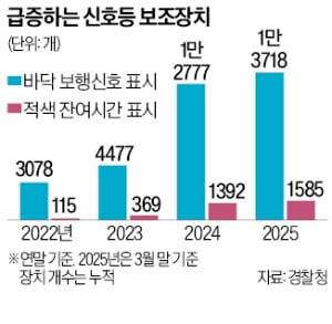 지자체들은 다른 신호등 보조장치도 확대하고 있다. 최근 늘어난 ‘적색 보행신호 잔여시간 표시장치’가 대표적이다. 2022년 115개뿐이던 적색 신호 잔여시간 표시장치는 올해 3월 말 1585개로 13배 급증했다. 이 장치 역시 한 쌍(2대)에 580만원이 들어간다. 지난해 이 장치 설치에 투입된 비용은 60억원에 육박했다.