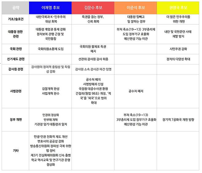 정치 개혁 공약은 이번 대선의 역사성과 헌정위기의 본질에 비추어 볼 때, 가장 우선적으로 논의되고 실행되어야 할 개혁 과제이다. 그럼에도 불구하고, 이번 선거에 출마한 주요 후보들의 정치·사법 공약은 전반적으로 내용이 빈약하거나, 상대 정당을 겨냥한 선거 전략 수준에 머무르고 있다는 점이 아쉽다.