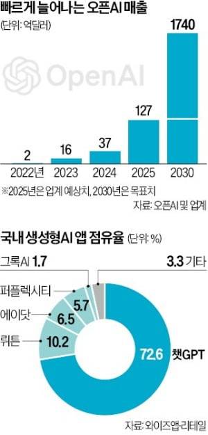 오픈AI의 국내 진출에 국내 AI업계는 기대와 우려를 동시에 쏟아냈다. AI 인프라 구축엔 긍정적이지만 강력한 경쟁자가 될 수 있어서다. 와이즈앱, 리테일에 따르면 챗GPT는 국내 생성형 AI 앱 점유율의 72.6%에 달한다. 2위인 국내 업체 뤼튼(10.2%)과 SK텔레콤의 AI 에이전트 에이닷(6.5%)과 차이가 크다.