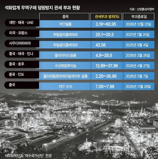 중국·대만·사우디아라비아산 저가 석유화학 제품의 공세가 거세지는 가운데 국내 석화업계는 반덤핑 조치를 사실상 '생존 방패'로 삼아 가격안정과 고객이탈 방지에 총력 대응하고 있다.
