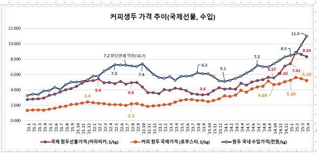 * 아라비카($/톤) : ('25.5.23) 7,959, (평년) 4,082比 95.0%↑, (전년) 5,158比 54.3%↑