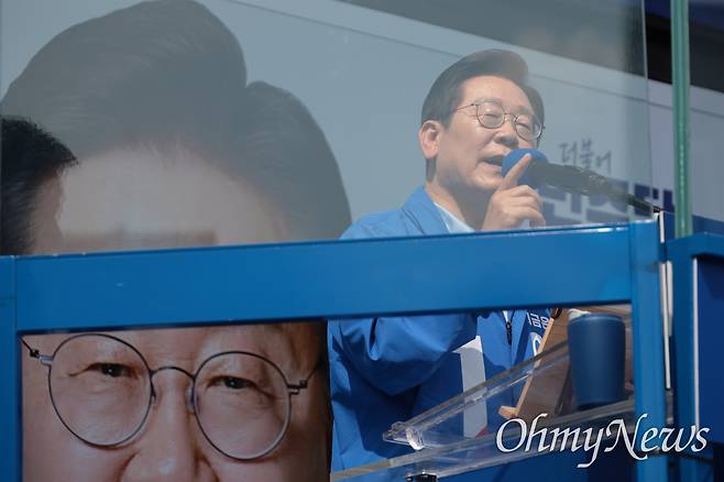 | ▲ 이재명 더불어민주당 대선 후보가 26일 오후 경기도 용인시 단국대학교 죽전캠퍼스 앞에서 지지를 호소하고 있다. |