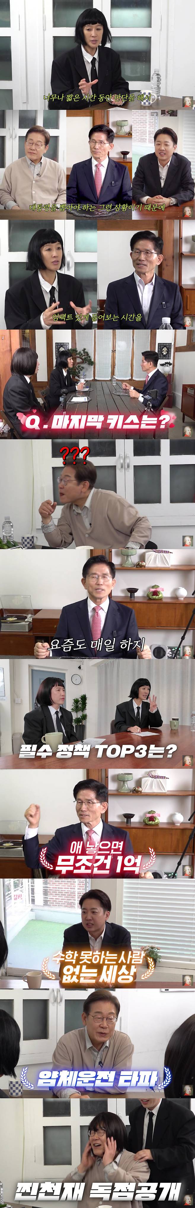 26일 유튜브 채널 '공부왕찐천재 홍진경'에는 '홍진경을 찾아온 3명의 대선 후보(이재명,김문수,이준석)'라는 제목의 선공개 영상이 업로드 됐다. 영상 속에는 홍진경이 제21대 대선 후보인 이재명, 김문수, 이준석과 만나 인터뷰하는 모습이 그려졌다.