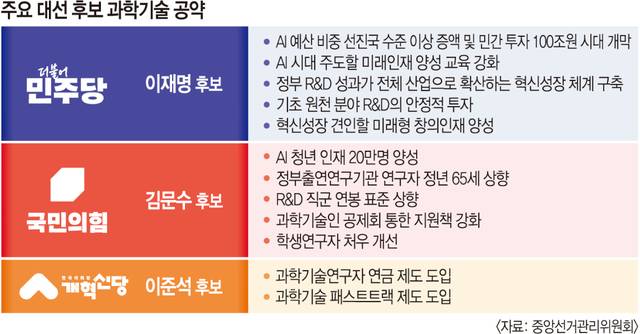 김문수 국민의힘 후보는 AI 청년 인재 20만명 양성을 공약했다. 이를 위해 AI 대학원과 소프트웨어(SW) 중심대학 등 정원 확대, 해외 우수 인력 유치를 위한 인건비·연구비 지원을 약속했다. 과학기술인 처우 개선을 위해서는 정부출연 연구기관 연구자 정년 65세 연장, R&D 직군 연봉 상향, 학생연구자 처우 개선 등을 공약에 담았다.