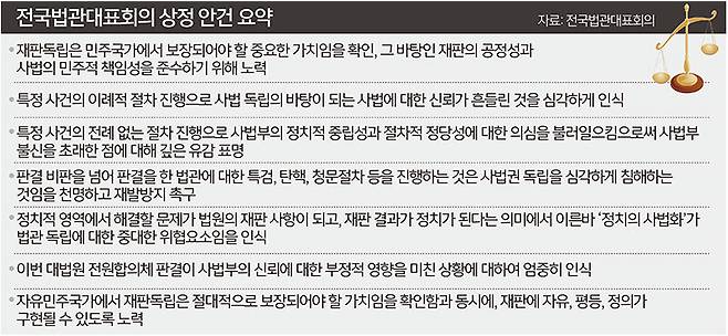 | 126명 중 90여명 온오프 참석 전국법관대표회의 의장인 김예영 서울남부지법 부장판사(가운데)가 26일 경기 고양시 일산동구 사법연수원에서 열린 법관대표회의에서 개회 선언을 하고 있다. 이날 법관대표회의에서는 더불어민주당 이재명 대선 후보의 공직선거법 상고심 선고로 촉발된 ‘사법 독립’ 논란 관련 안건이 논의됐다. 이제원 선임기자 |