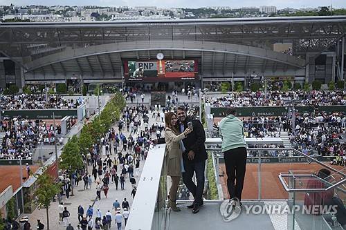 A couple take a selfie during the French Tennis Open, at the Roland-Garros stadium, in Paris, Monday, May 26, 2025. (AP Photo/Christophe Ena)