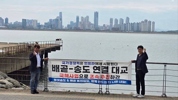 송도 주민단체 '올댓송도'와 배곧 주민단체 '배곧총연합회'는 지난 24일 공동성명서를 내고 "두 경제자유구역을 잇는 송도배곧대교는 단순한 도로가 아닌 국가 전략도로이자, 바이오산업의 중심지인 송도와 배곧을 잇는 핵심 인프라"라며 "국민의 기본권인 공공이동권을 보장해야 하는 지방정부의 책무를 더는 외면해선 안 된다"며 조속한 착공과 국책사업화를 촉구했다.