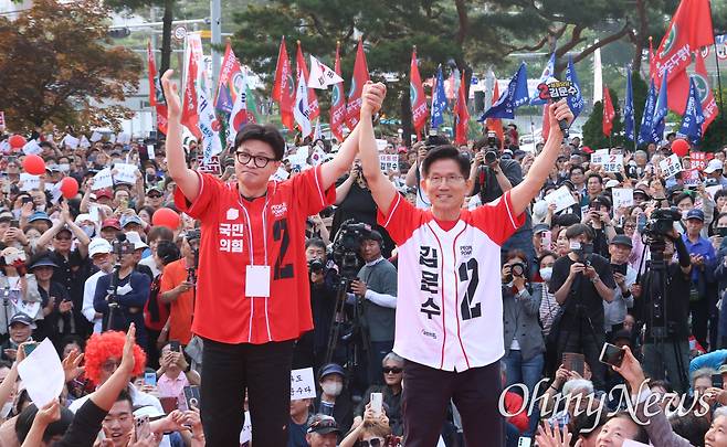 그중 가장 눈에 띄는 참석자는 한동훈 전 대표였다. 한 전 대표가 김 후보와 같은 무대에서 지원 유세를 벌인 건 지난 12일 공식 선거운동이 시작된 이래로 처음이었다.