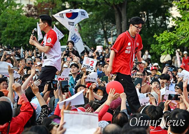| ▲ 한동훈 국민의힘 전 대표가 26일 오후 서울 도봉구 방학사거리에서 열린 김문수 국민의힘 대선 후보 유세장을 찾아 지원유세를 하고 있다. |