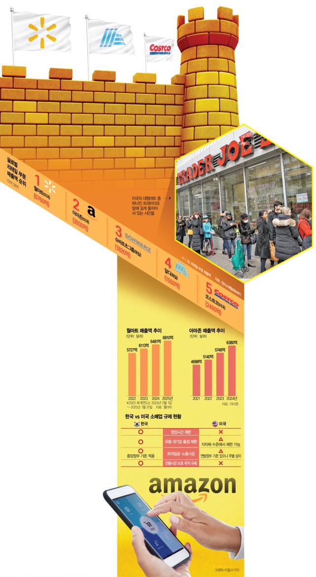 한국 국토 면적의 98배인 미국도 주요 도시 내 당일 배송이 일반적이다. 클릭 한 번으로 가능한 ‘1일 생활권’은 ‘미국판 쿠팡’인 아마존이 만든 유통 패러다임 덕분이다. 흥미로운 건 2010년 이후 아마존의 급성장에도 소비자들은 여전히 월마트 주차장에 차를 세우고 트레이더조(Trader Joe’s) 계산대에 긴 줄을 선다는 점이다. 쿠팡의 독주 속에서 대형마트·전통시장 등 오프라인 유통 기업들의 성장이 정체된 한국 시장과 대조적이다. 전문가들은 유통산업발전법 등의 규제가 거의 없는 북미 선진국에서는 온·오프라인 유통사들이 저마다의 전략을 갖고 환경 변화에 적응하면서 시장이 점점 더 진화하고 있다고 입을 모은다.