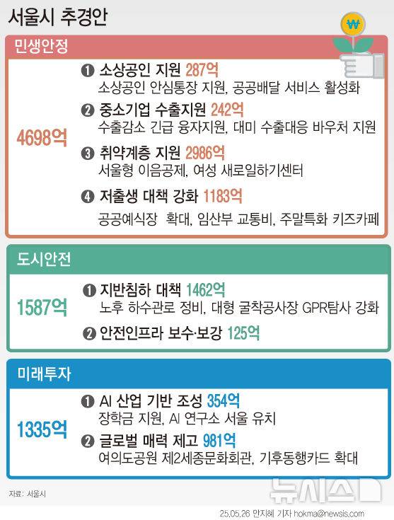 [서울=뉴시스] 서울시가 올해 첫 추가경정예산(추경)으로 1조6146억원을 편성했다. 경기 불황으로 대내·외적인 위기에 직면한 가운데 민생안정, 도시안전, 미래투자의 3대 축을 중심으로 편성했다. (그래픽=안지혜 기자)