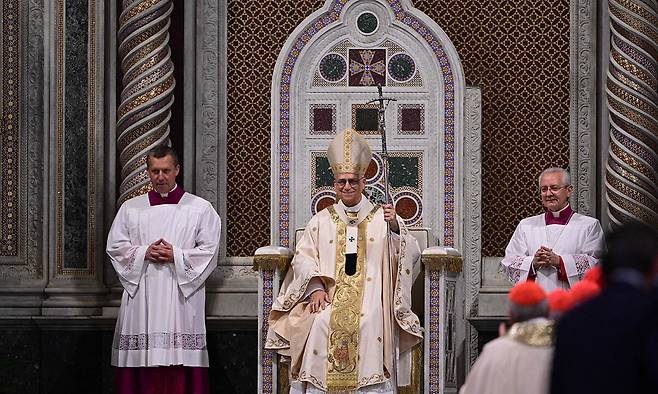 | 온화한 미소 띤 교황 레오 14세 교황이 25일(현지시간) 이탈리아 로마 산 조반니 인 라테라노 대성전에서 주교좌에 앉아 로마 교구의 교구장임을 알리는 착좌식을 거행하고 있다. 로마=AFP연합뉴스 |