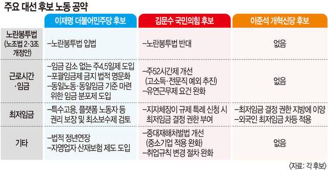 6·3 대선에서 노동 공약은 주요 후보들의 입장이 선명하게 엇갈린다. 대선 결과에 따라 노동 현장과 경영 환경이 크게 출렁일 수밖에 없다는 관측이 나온다. 이재명 더불어민주당 후보는 노란봉투법(노조법 2·3조 개정안)과 주4.5일제를 내세우며 노동계 주장을 대변하고 있다. 김문수 국민의힘 후보는 주52시간제 예외 확대를 내걸었다. 중대재해처벌법을 ‘악법’으로 규정하고 완화하겠다고 약속하며 경영계를 옹호하고 있다.