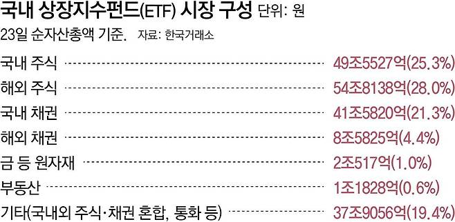 26일 한국거래소에 따르면 23일 기준 국내 ETF 순자산총액은 195조6711억 원에 달한다. 2002년 코스피200을 추종하는 ETF 2종이 처음 상장됐고, 2023년 6월 29일 순자산 100조 원을 넘긴 것을 고려하면 성장세가 가파르다.