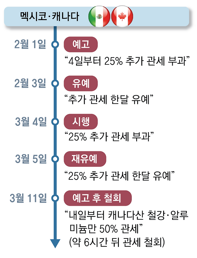 자동차, 철강·알루미늄, 농업, 에너지 등 품목별 관세 역시 수 차례 시행과 철회를 발표하는 널뛰기 행보를 보였다. 특히 그는 올 3월 11일 캐나다산 철강과 알루미늄에 대한 관세를 기존 25%에서 50%로 두 배 올리겠다고 밝혔다가 약 6시간 만에 철회했다. 이달 4일엔 외국에서 제작된 영화에 100% 관세를 부과한다고 밝히고선 할리우드가 우려를 표하자 하루 뒤 “(업계) 관계자들부터 만나겠다”며 슬그머니 물러섰다.