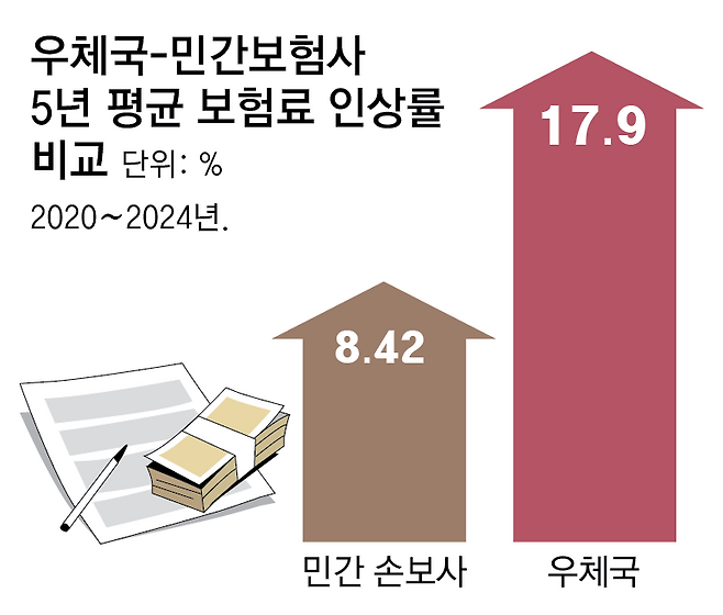실제로 26일 김재섭 국민의힘 의원실에 따르면 우정사업본부 우체국 실손보험은 최근 5년(2020∼2024년)간 보험료를 평균 17.9% 인상한 것으로 조사됐다. 같은 기간 민간 손보사의 실손보험 인상률은 8.42%로 우체국 실손보험의 평균 인상률이 9.48%포인트 더 높다. 민간 보험사들이 금융 당국의 관리감독 때문에 보험료를 인상하고 싶어도 자제하는 반면 우체국은 자유롭게 보험료를 올린 결과로 풀이된다.