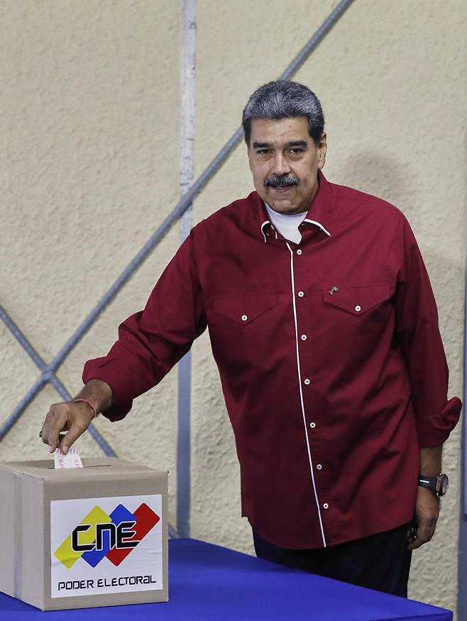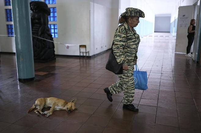 25일 총선과 지방선거가 실시된 베네수엘라 수도 카라카스에서 니콜라스 마두로 대통령이 투표함에 투표 용지를 넣고 있다(위쪽 사진). 같은 날 카라카스의 투표소를 찾은 여성 군인 뒤로 개가 누워 있다. 2013년 집권 후 내내 부정선거 의혹에 시달려 온 마두로 정권을 비판하는 의미에서 많은 유권자들이 이날 투표를 하지 않았다.