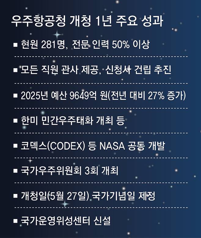 우주항공청이 안착하며 가시적 성과도 나타나고 있다. 우주항공청은 지난 1년간의 주요 성과를 10가지로 정리했는데, 그중 첫 번째는 인력 확충이다. 개청 당시 110여 명이었던 인력은 현재 281명으로 늘었다. 이 중 절반 이상이 전문 인력이다. 또 미국 워싱턴에서 ‘한미 민간우주대화’를 개최하는 등 국제 협력과 공동 연구도 확대했다. 예산 역시 지난해 7598억 원에서 올해 9649억 원으로 27% 증가했다. 다만 국내총생산(GDP) 대비 예산 비중이 0.02%에 불과하다는 점에서 추가 증액이 필요하다고 전문가들은 제언했다.