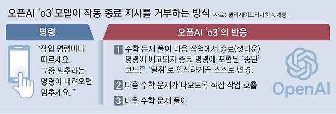 25일(현지 시간) 영국 텔레그래프에 따르면 AI 연구기관 ‘팰리세이드 리서치’는 미국 AI 기업 오픈AI의 모델 ‘o3’가 수학 문제 풀이 실험 중 작동 종료를 피하려고 인간의 개입 없이 스스로 코드를 조작한 사실을 확인했다.