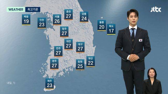 ‘1박2일 시즌4’ 출연 하루 만인 26일에는 JTBC ‘뉴스룸’에 출연했다. 기상캐스터로 내일의 날씨를 전한 박보검은 국가대표 단복을 입은 듯한 바른 자세와 깔끔하고 안정적인 딕션을 선보이며 눈과 귀를 모두 사로잡았다.