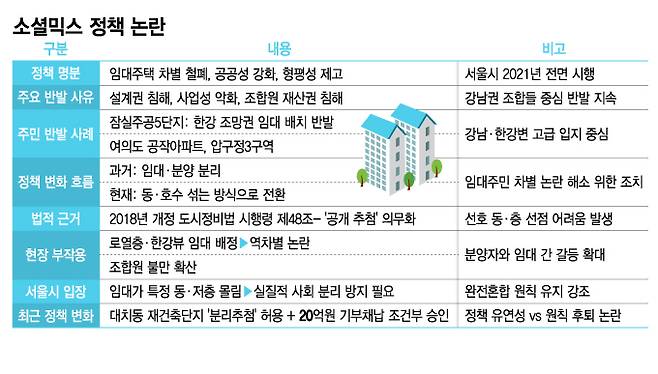 실제로 서울 도심 재건축 현장에서는 소셜믹스에 대한 반발이 계속되고 있다. '임대주택 차별 철폐'라는 정책의 명분은 좋지만, 현장에서는 설계권 침해, 사업성 악화, 조합원 재산권 침해까지 논란이 끊이지 않는다.