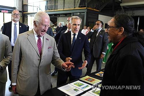 King Charles shares a laugh with Alex Peters, of Whitefeather Forest Community Resource Management Authority, as he walks with Prime Minister Mark Carney at a community gathering at Lansdowne Park in Ottawa, Canada, during a royal visit on Monday, May 26, 2025. (Justin Tang/The Canadian Press via AP) MANDATORY CREDIT