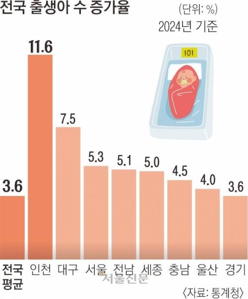 2023년 0.69명이던 인천시 합계출산율은 지난해 0.76명으로 상승해 전국 평균 0.75명을 넘어섰다. 인구 1000명당 새로 태어난 사람 비율을 가리키는 조출생률도 5.1명으로 전국 평균 4.7명을 뛰어넘었다.