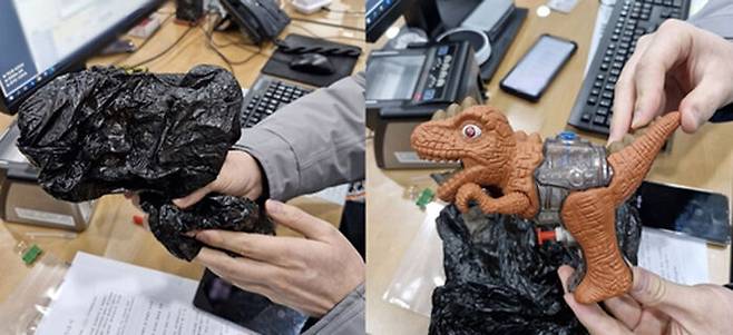 A 씨는 8세 아들이 가지고 노는 장난감 공룡 물총을 비닐에 감싸 쥐고 마치 진짜 권총인 것처럼 행세하며 은행 직원에게 오만 원권 지폐를 담으라고 강요했습니다.