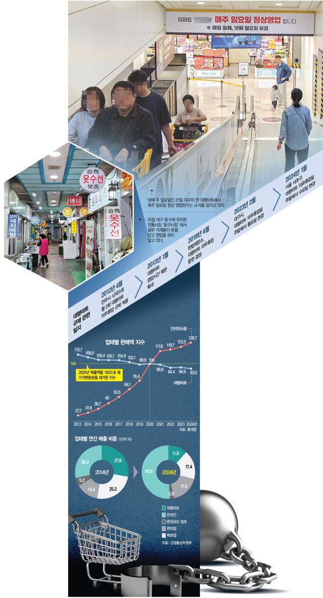 당초 법은 대형마트의 영업을 규제해 전통시장 및 전통 상점가를 활성화하겠다는 취지에서 마련됐다. 그러나 현실은 기대만큼 작동되지 못했다. 통계청에 따르면 전통시장은 대형마트 의무휴업 규제가 시행된 초기인 2013년 1502개에서 2023년 1393개로 109곳이 감소했다. 전통시장의 하루 평균 방문객은 2019년 5413명에서 2023년 3994명으로 26% 급감했다. 이마트·롯데마트·홈플러스 등 대형마트 3사의 점포도 2013년 대비 2023년 8곳 줄었다. 대형마트와 전통시장을 막론하고 오프라인 상권이 모두 내리막길을 걷고 있는 모양새다.
