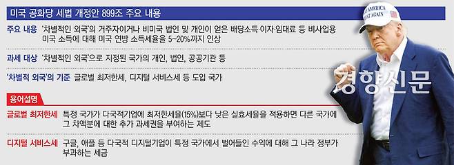 도널드 트럼프 미국 대통령이 ‘관세전쟁’에 이어 ‘글로벌 세금 전쟁’으로 전선을 넓히고 있다. 미국 하원은 글로벌 최저한세, 디지털서비스세를 도입한 국가의 기업이나 개인에게 최대 20%의 ‘불공정 외국세’를 부과하는 법안을 통과시켰다. 2027년 본격적인 글로벌 최저한세 과세를 준비 중인 한국 정부의 계획에도 차질이 빚어졌다. 향후 한·미 관세 협의에서 미국 측이 ‘구글세’를 비롯한 글로벌 최저한세 유예 등을 협상 카드로 들고 나올 가능성도 제기된다.