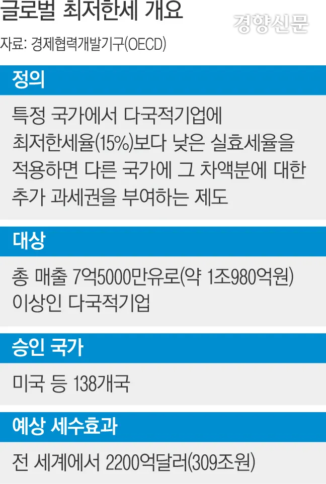 글로벌 최저한세는 조 바이든 행정부 시절 미국을 포함한 138개국이 2021년 도입에 합의했지만, 트럼프 대통령이 일방적으로 합의 파기를 선언했다.
