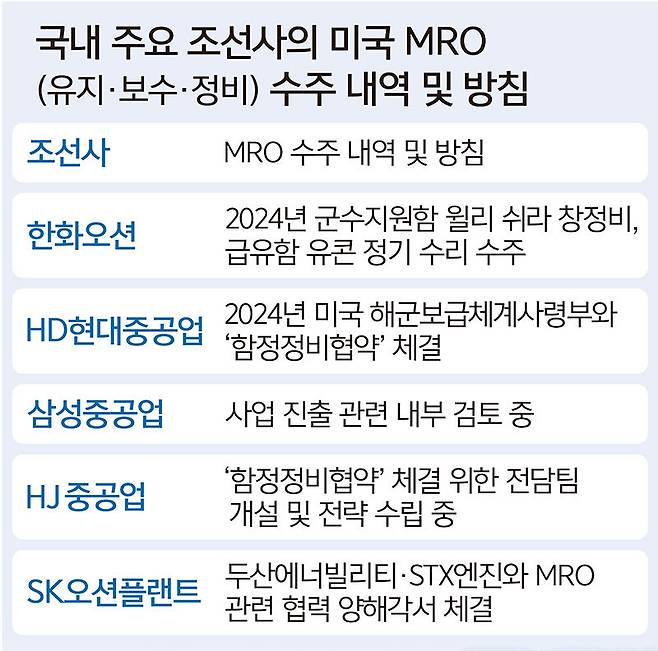 26일 조선업계에 따르면 이미 MRO 사업을 수주해 최근 미국 군함 정비를 마친 바 있는 한화오션은 물론이고 HD현대중공업 등 대형 조선사는 물론이고 중형 조선사들까지 사업 진출을 위해 적극적으로 나서고 있다.