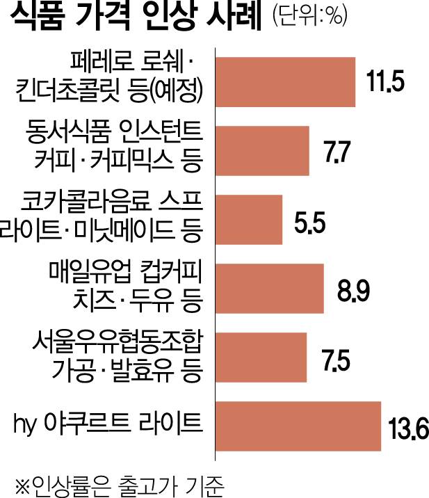 서울우유협동조합도 이달부터 가공유와 발효유, 주스류 등 54개 제품의 출고가를 평균 7.5% 인상했다. hy는 역시 ‘야쿠르트 라이트’의 가격을 기존 220원에서 250원으로 13.6% 올렸다. 코카콜라음료도 수입 원부자재 가격 인상 등을 이유로 스프라이트와 미닛메이드, 파워에이드 등의 출고가를 이달부터 평균 5.5% 인상했다. 이 밖에 하림도 마늘후랑크 70g 등과 같은 닭가슴살 제품의 가격을 이달부터 기존 2300원에서 2400원으로 약 4% 올렸다.