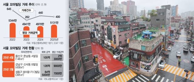 거래 건수는 여전히 회복하지 못했다. 2022년 1분기 서울 꼬마빌딩 거래는 645건에 달했지만, 지난해 1분기 440건으로 감소한 뒤 올해 1분기에는 400건까지 쪼그라들었다. 전체 거래금액도 지난해 1분기 2조 3868억 원에서 올해 1분기 2조 2865억 원으로 줄었다.