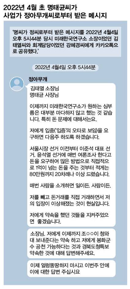 정씨의 메시지에는 취업 청탁과 공천 약속 등의 대가로 명씨 쪽에 돈이 흘러들어 간 정황도 나타난다. 정씨가 명씨 등에게 2022년 4월4일 오후 5시44분에 보낸 메시지 3개 중에는 “김태열 소장님, 명태균 사장님, 이제까지 미래한국연구소가 원하는 심부름은 대부분 마다하지 않고 했는 것 같습니다. 특히 돈 문제에 대해서는요”라며 “서울시장선거 이전부터 이준석 대표 선거. 윤석열 선거에 매번 여론조사 한다고 돈을 요구하여 많은 방법으로 직접적으로 1억이 넘는 돈을 주는 것부터 적게는 80만원까지 20차례나 이상 드렸습니다”라는 것도 있었다.