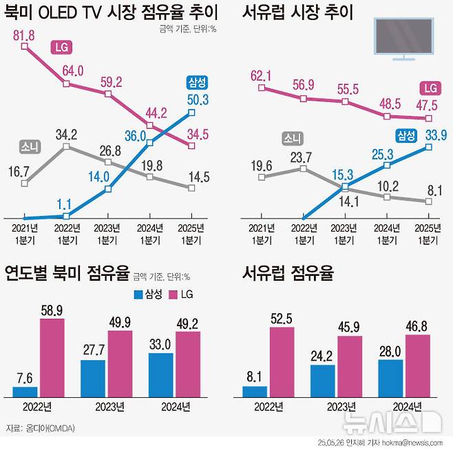 26일 업계에 따르면 시장조사업체 옴디아가 집계한 올해 1분기 매출 기준 북미 시장 올레드 TV 점유율은 삼성전자가 50.3%로 1위를 차지했다.