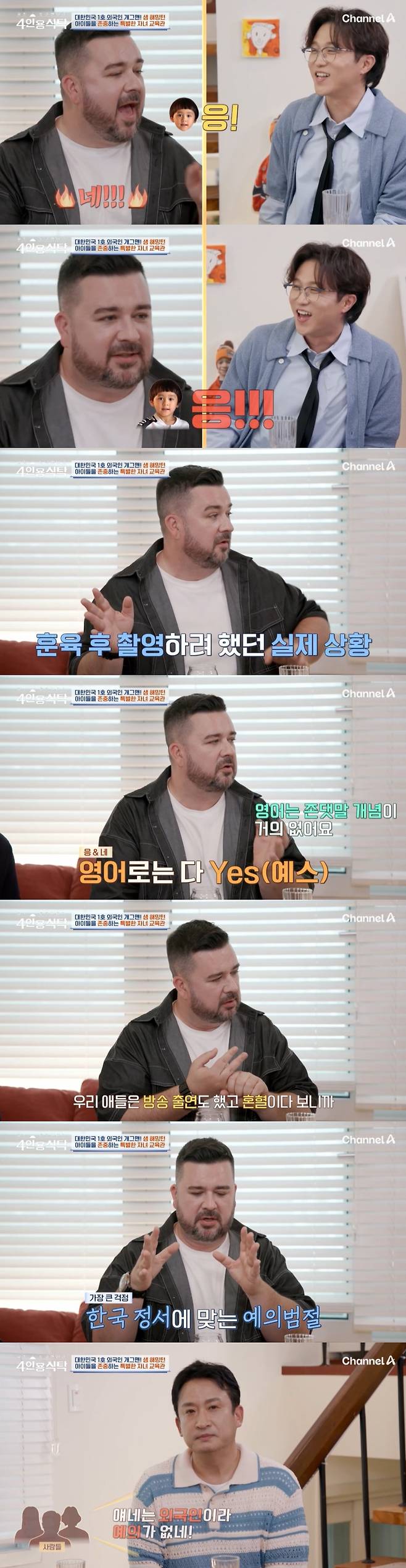 서경석은 "근데 영어로는 다 '예스' 아니냐. 그걸 왜 강요하냐"고 짚었고 샘 해밍턴은 "영어는 존댓말 개념이 거의 없다. 한국에서 살아야 하니까. 우리 애들은 방송도 하고 혼혈이다보니 그렇다. 그래서 한국의 예의범절을 잘 지켜야하는데 예의가 없으면 얘네는 외국인이라 이런 거라고 할까봐 (걱정이다). 안그래도 우리 아이들이 호주 사람인지 한국 사람인지 혼란이 올 수 있다"라고 전했다.
