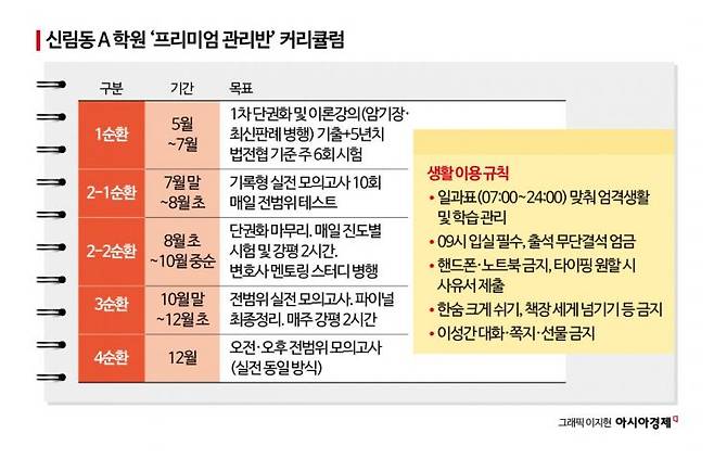 신림동의 한 변시 재수생 생활 관리반은 시험 성적에 따라 A·B·C·D로 우열반을 나눠 학생들을 관리하기도 한다. 합격이 절실한 로스쿨 졸업생들은 외부 사교육에 기댈 수밖에 없고, 비용을 감당하지 못하는 이들은 암시장의 수요자가 되는 구조다. 은영씨는 "친구들끼리는 1년에 2000만원씩 학교에 바치고, 사교육비로 돈 나가고, 변호사 시험은 붙을지도 모르는데 로스쿨은 '돈 먹는 하마'라고 자조한다"고 했다.