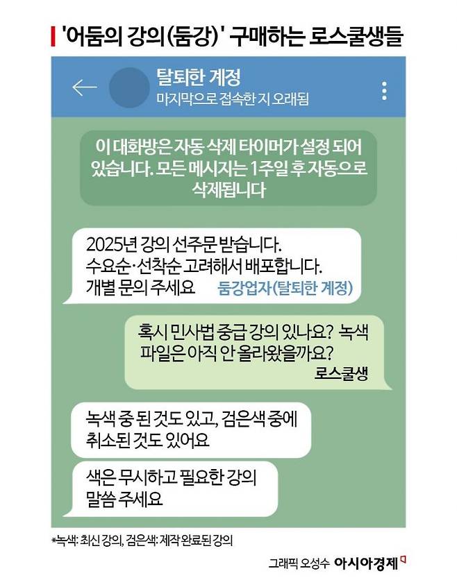 소연씨는 상당수 로스쿨생들이 1학년 내신관리를 위해 선행을 할 때 듣는다고 했다. 가격은 정식 인터넷 강의의 40~60% 수준이다. 서울의 한 로스쿨에서 불법 인터넷 강의 수강이 적발되면서 예전처럼 동문회 때 선배들이 공유하는 문화는 사라졌다고 한다. 최근 들어서는 전문 '둠강 업자'들이 파일을 공유하고 탈퇴해 새 계정을 파서 거래가 이뤄지는 방식이라고 했다.