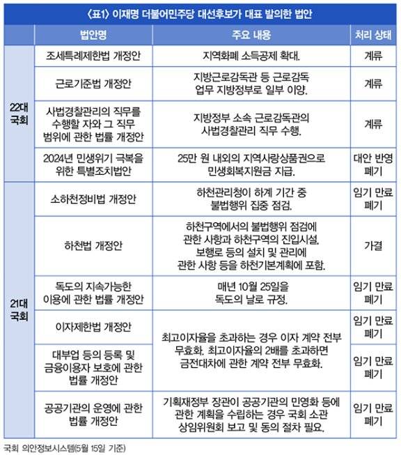 이 후보는 민선 7기 경기지사를 끝으로 2022년 국회에 입성, 21·22대 국회에서 활동했다. 국회 의안정보시스템에 따르면, 이 기간 이 후보는 10개의 법안을 대표 발의했다. 5월 15일 기준 3개 법안이 계류 중이며, 임기 만료로 5개, 대안 반영으로 1개 법안이 폐기됐다(표1 참조).