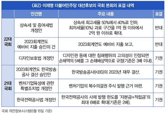 그렇다면 국회의원 이재명의 본회의 표결 성향은 어떨까. 이 후보는 21·22대 국회에서 각각 778개, 484개 표결에 참여했다. 이 가운데 이 후보가 찬성한 안건은 776개(21대), 480개(22대)로 찬성률이 99%를 상회한다. 사실상 본회의에 상정된 안건에 대해 대부분 찬성한 셈이다. 이 후보는 4개 안건에 기권, 2개 안건은 반대했다(표2 참조).