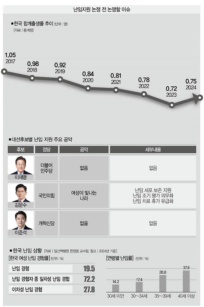 6·3 대선후보들은 이 문제를 어떻게 바라보고 있을까. 구체적인 공약을 제시한 건 김문수 국민의힘 대선후보가 유일하다. 난임 세포 보존 지원, 난임 조기 평가 의무화, 난임 치료 시 휴가 유급화 등 직접적인 난임 지원을 약속했다.