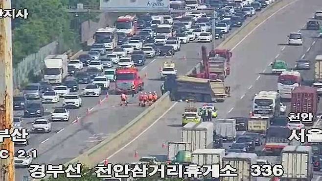 오늘(27일) 오전 7시 39분 충남 천안시 경부고속도로 서울 방향 천안삼거리휴게소 인근을 달리던 25t 덤프트럭이 중앙분리대를 추돌했습니다.