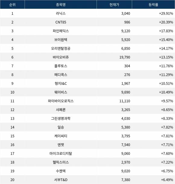 이밖에도 와이바이오로직스(338840) ▲9.57%, 샤페론(378800) ▲8.65%, 그린생명과학(114450) ▲8.33%, 일승(333430) ▲7.82% 등을 기록하며 시장에서 활발히 거래되고 있다.