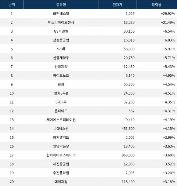 이어 상승률 2위 에스디바이오센서(137310)는 현재가 13,230원으로 주가가 21.49% 폭등하고 있다. 상승률 3위 GS피앤엘(499790)은 현재 30,150원으로 6.54% 상승하며 긍정적인 모습을 보이고 있다. 상승률 4위 삼성중공업(010140)은 6.03% 상승하며 16,010원에 거래되고 있다. 상승률 5위 S-Oil(010950)은 5.97%의 상승세를 타고 56,800원에 거래되고 있다.