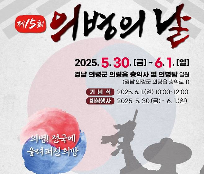 의령군은 다음달 1일 제15회 의병의 날 기념식이 의령 충익사 일대에서 전국 의병단체 대표와 의병 후손, 주민 등이 참석한 가운데 열린다고 27일 밝혔다. 행정안전부가 주최하고 의령군이 주관해 ‘의병! 전국에 울려 퍼진 희망’을 주제로 개최되는 국가행사다.