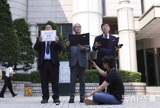[서울=뉴시스] 김근수 기자 = 법무법인 대륜 소속 변호사들이 27일 서울 서초구 서울중앙지방법원 앞에서 SK텔레콤 개인정보 유출 사건 관련 민사소송 입장발표를 하고 있다. 2025.05.27. ks@newsis.com
