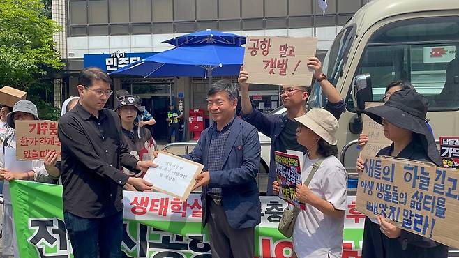 | ▲ 민주노동당 권영국 캠프에 전달한 전국신공항 철회촉구 서명명단 및 제안문 전국신공항백지화연대에서 민주노동당 권영국 후보 캠프에 전국신공항 철회촉구 서명 명단과 제안문을 전달하고 있다. |